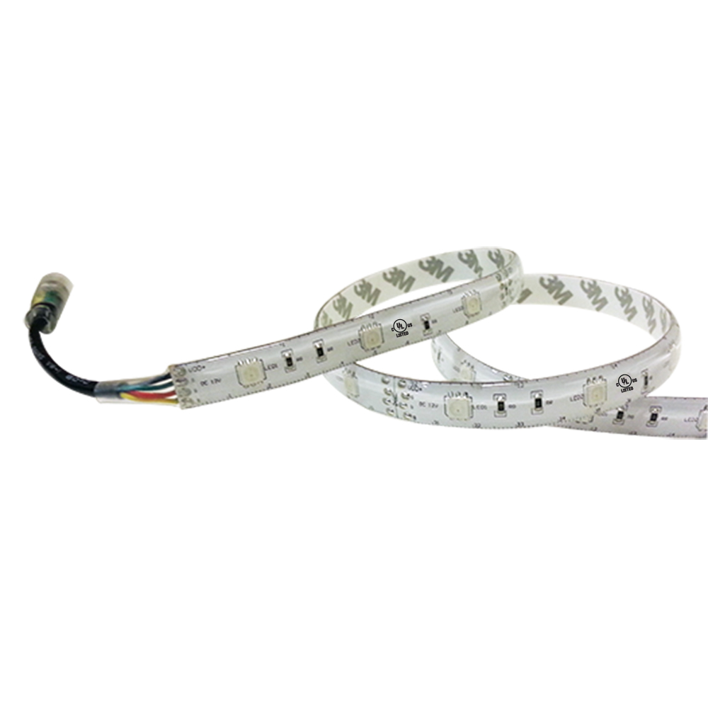 Outdoor RGB Moisture Proof Flexible LED Tape is an ultra-thin flexible LED strip that includes outdoor weatherproof connectors both ends of the strip. The strip is available in RGB color changing. Cuttable every 3 LEDs. Custom lengths, 10M max.